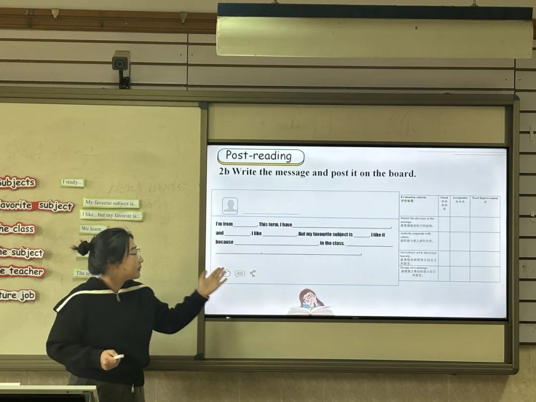 杨晔老师授课内容是七年级上册Unit4 Section B What can you learn from different subjects?杨老师的阅读课以巧猜课程表活动为导入,激发了员工们的学习兴趣,贴近日常的课程话题,让员工们更具有表达欲。读前、读中、读后的逐级主题活动设计,以及对文本的深入剖析,让员工们对课程有了更深刻的理解和个性化的评价。