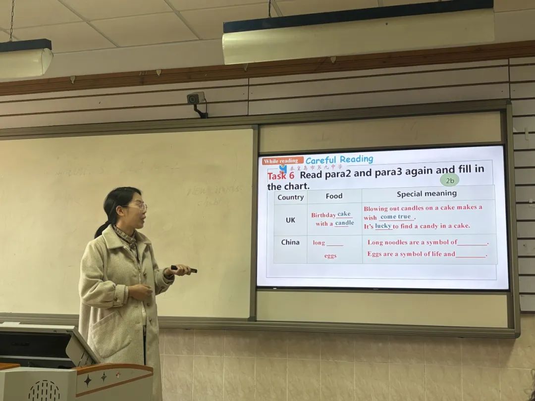 陈晓老师授课内容是七年级下册Unit 10 Section B Birthday food around the world。陈老师的阅读课以生日视频为导入,向同学们展示生日的主题元素。预测、略读、精读等阅读技巧的综合使用,训练了员工们的阅读能力,同时,陈老师还对语篇进行了结构化地分析,这无疑对员工的写作具有实操性的指导作用。