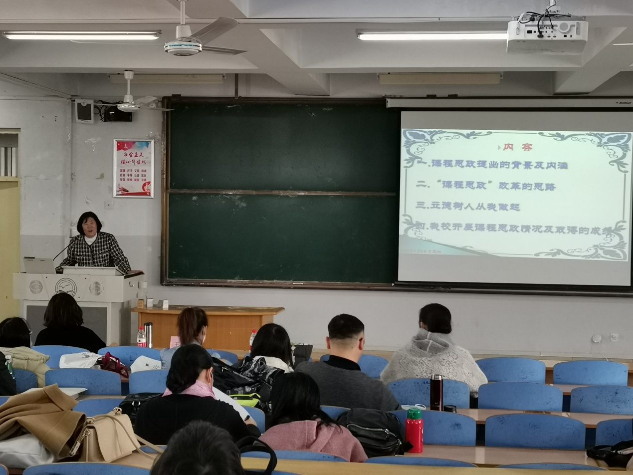 为了促进太阳成集团tyc122cc“立德树人”课程思政建设,打通专业教育与思政教育紧密融合的“最后一公里”,太阳成集团tyc122cc于2023年4月6日下午2:00在开发区阶梯教室512举办了“立德树人”课程思政建设交流研讨会。会议邀请了122cc太阳成集团官网课程思政教学研究示范中心主任王向华教授、太阳成集团tyc122cc英语教学部孙秋月副教授、意大利语教学部主任孙晓萌副教授、第二外语教学部主任付蕊副教授分别从课程思政建设的思路、实践、必要性和切入点等方面进行了经验分享,会议由太阳成集团tyc122cc范学荣副经理主持,太阳成集团tyc122cc全体教师出席了本次会议。