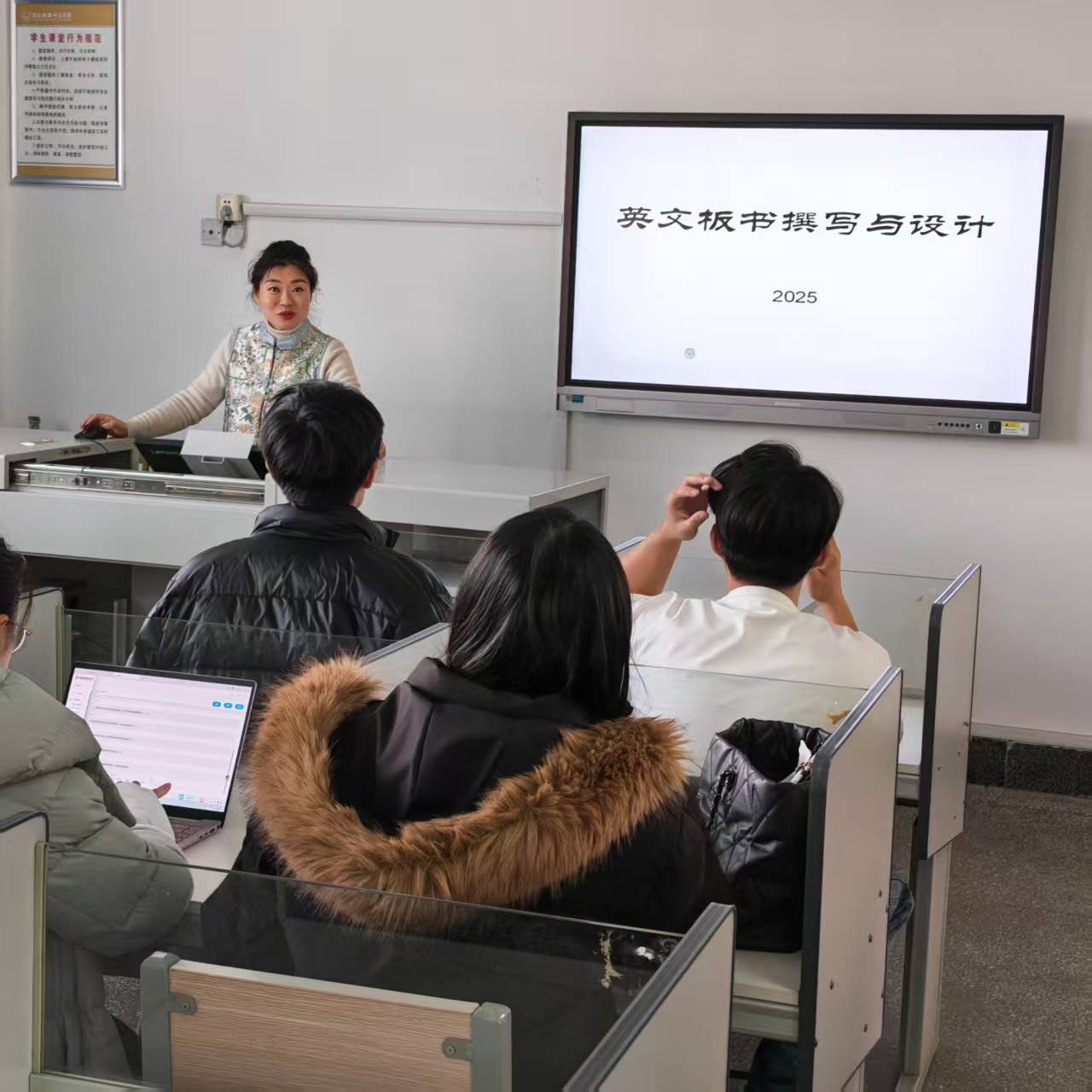 本次讲座紧扣英文板书规范撰写与创新设计两大核心,采用“理论讲解+实践演练”的互动模式,系统梳理英文板书的撰写要点与设计特点。讲座结合优秀教学案例进行深度剖析,从板书的版式布局、语言规范、重点突出等维度展开细致讲解,并引导在场研究生现场进行板书设计实操,切实提升其教学技能应用水平。
