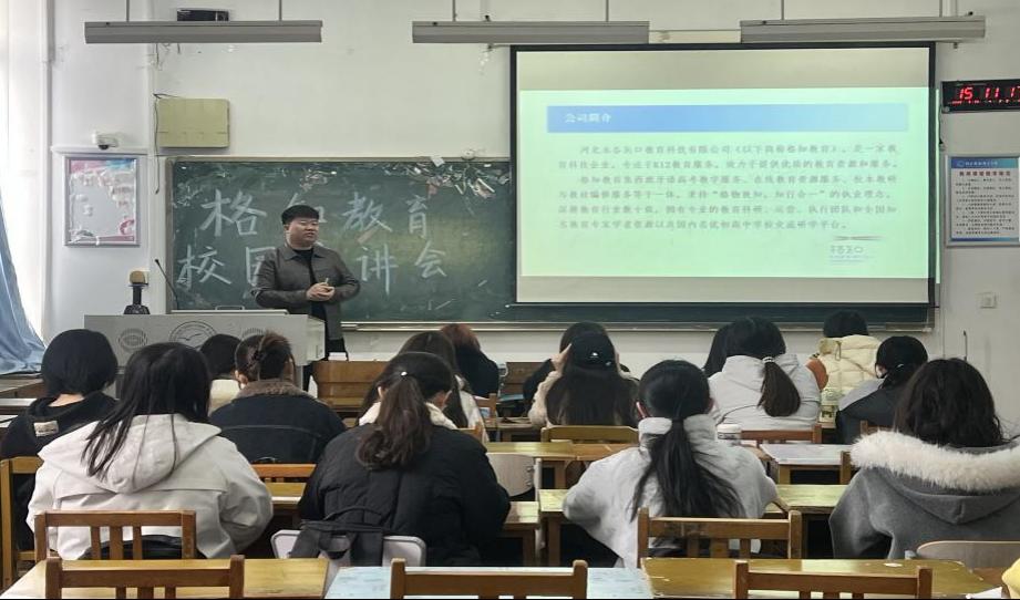座谈会后,专场宣讲会如期举行,公司西班牙语专业员工到场聆听。付小丁董事长详细介绍了公司发展情况、业务范围、招聘岗位、薪酬福利及职业发展路径,结合行业实际,为同学们讲解了西班牙语专业在教育领域的就业方向与实践要求。宣讲过程中,同学们认真聆听、积极提问,就实习安排、招聘标准、职业规划等疑问与企业负责人深入交流,现场氛围热烈有序。