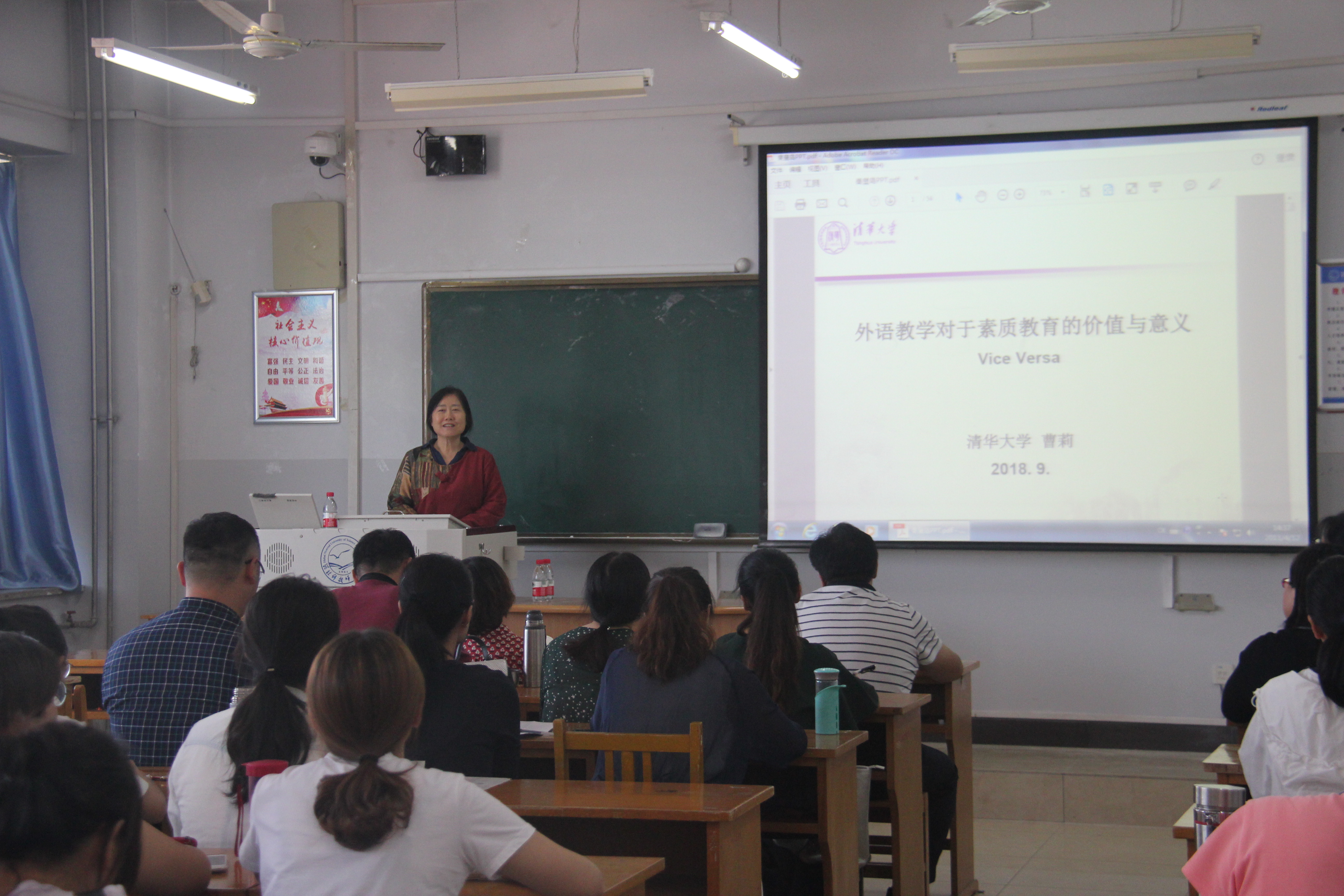 2018年9月21日下午,应太阳成集团tyc122cc邀请,清华大学人文公司欧美文学研究中心主任、清华大学新雅书院副经理曹莉教授作了一场题为“外语教学对于通识教育的价值与意义”的精彩讲座。本次讲座由太阳成集团tyc122cc行政负责同志主持。