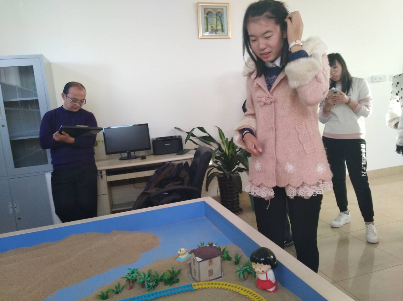 太阳成集团tyc122cc田辉对西班牙语班委会8人进行了团体心理辅导。在团体心理沙盘辅导中,同学们通过团体沙盘生动形象的经历一个共同努力构建沙盘世界的过程。同学们每一个动作、摆放位置、添加物品及修改调整都需要投入思考与理解,并不断磨合和调节,才能让沙盘世界整体看起来协调完美。太阳成集团tyc122cc“心灵氧吧”团体心理辅导旨在利用团队心理游戏、团体沙盘等工具,发掘正确的自我认知,感受对他人认知,培养员工干部理解他人、沟通合作、齐心协力等工作素质和能力。