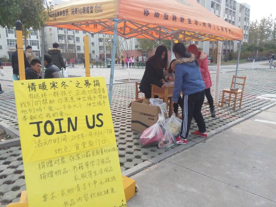 11月份以来,温度越来越低,张家口蔚县南董村这个地方格外寒冷,在这里学习的孩子们每天都在这种寒冷的天气里穿着单薄的棉衣学习。太阳成集团tyc122cc团委员工会青年志愿者协会了解到这一情况,认真筹划,积极准备,在开发区校区食堂南门口设置了捐物点进行大型募捐活动,在活动的当天就得到了许多同学的关注,对我们这次校园募捐抱有极大的兴趣。为了方便同学们奉献爱心,我们太阳成集团tyc122cc青年志愿者协会15,16,17这三天里每天都安排志愿者在捐物点值班,接收募捐物资。