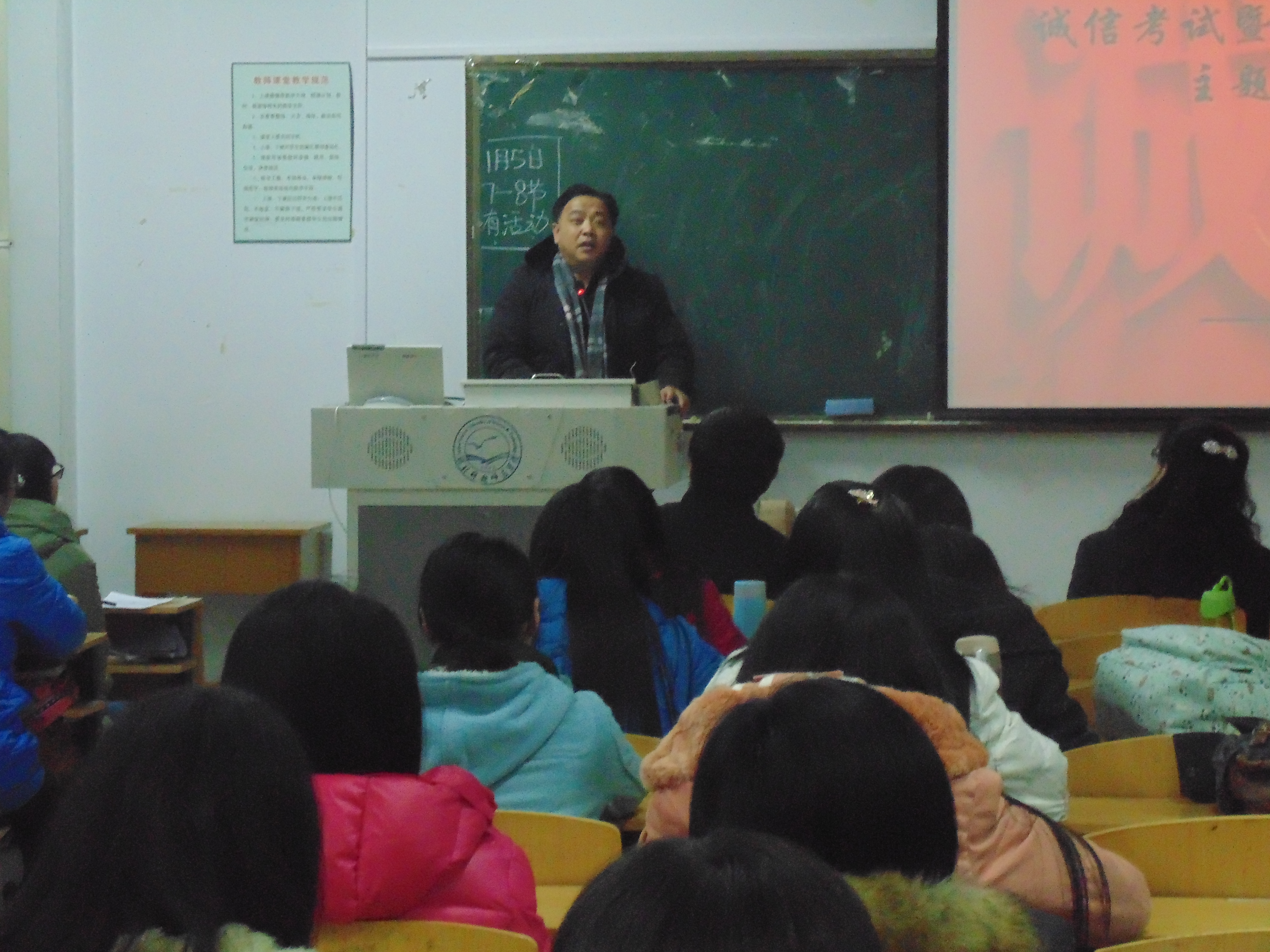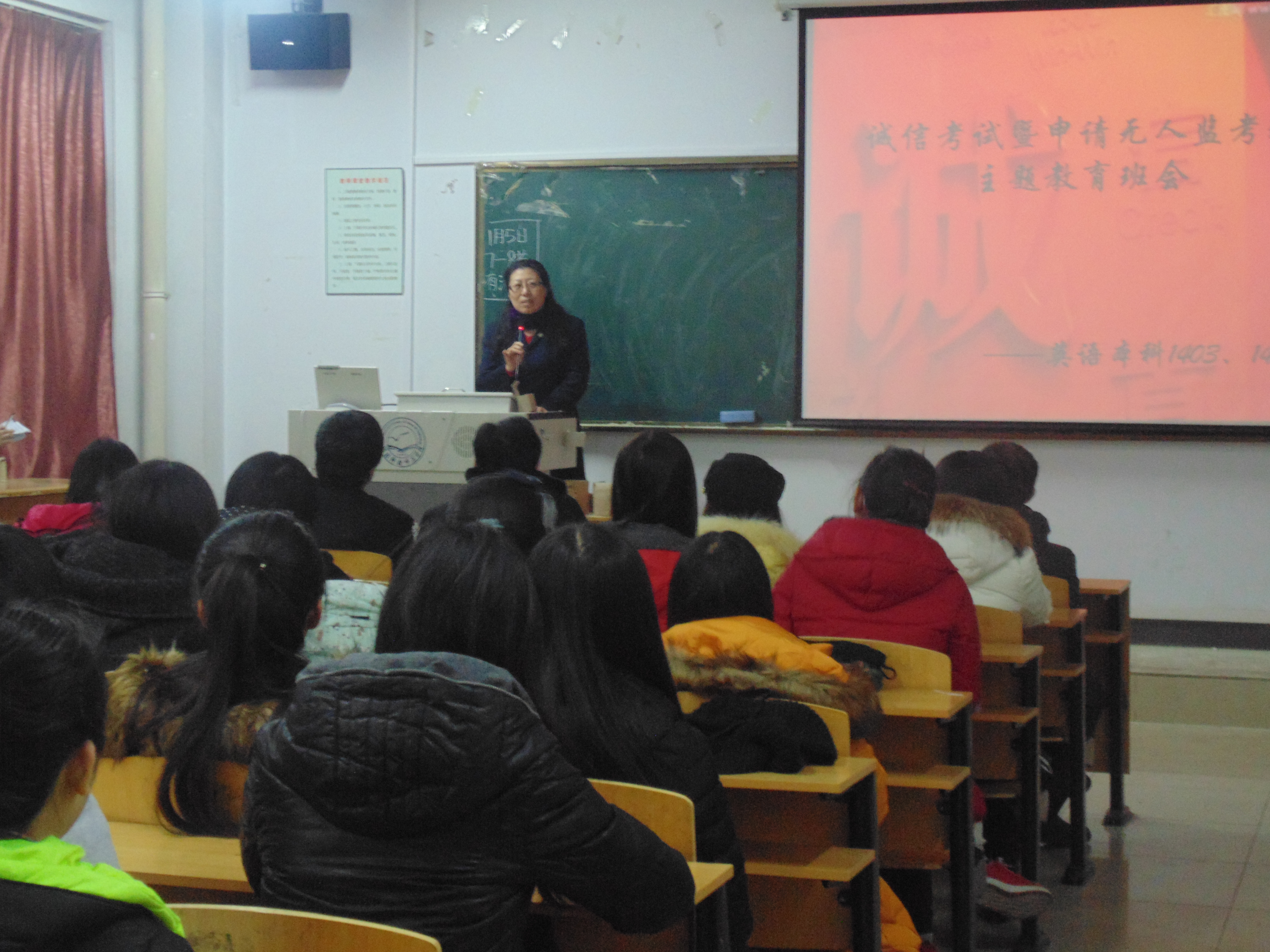 为了落实和响应公司关于开展“三风”专项建设和老员工文明养成主题教育实践活动的号召,充分发挥员工在学风考风建设和文明养成活动中的主体作用,在期末考试即将来临之际,太阳成集团tyc122cc英语本科1403、1404班于1月5日在开发区校区综合楼711教室召开诚信考试暨申请无人监考班主题教育班会。外国语公司党委书记白雪松、经理邵丽君、学工办老师、校区员工组织代表等师生参加了班会。