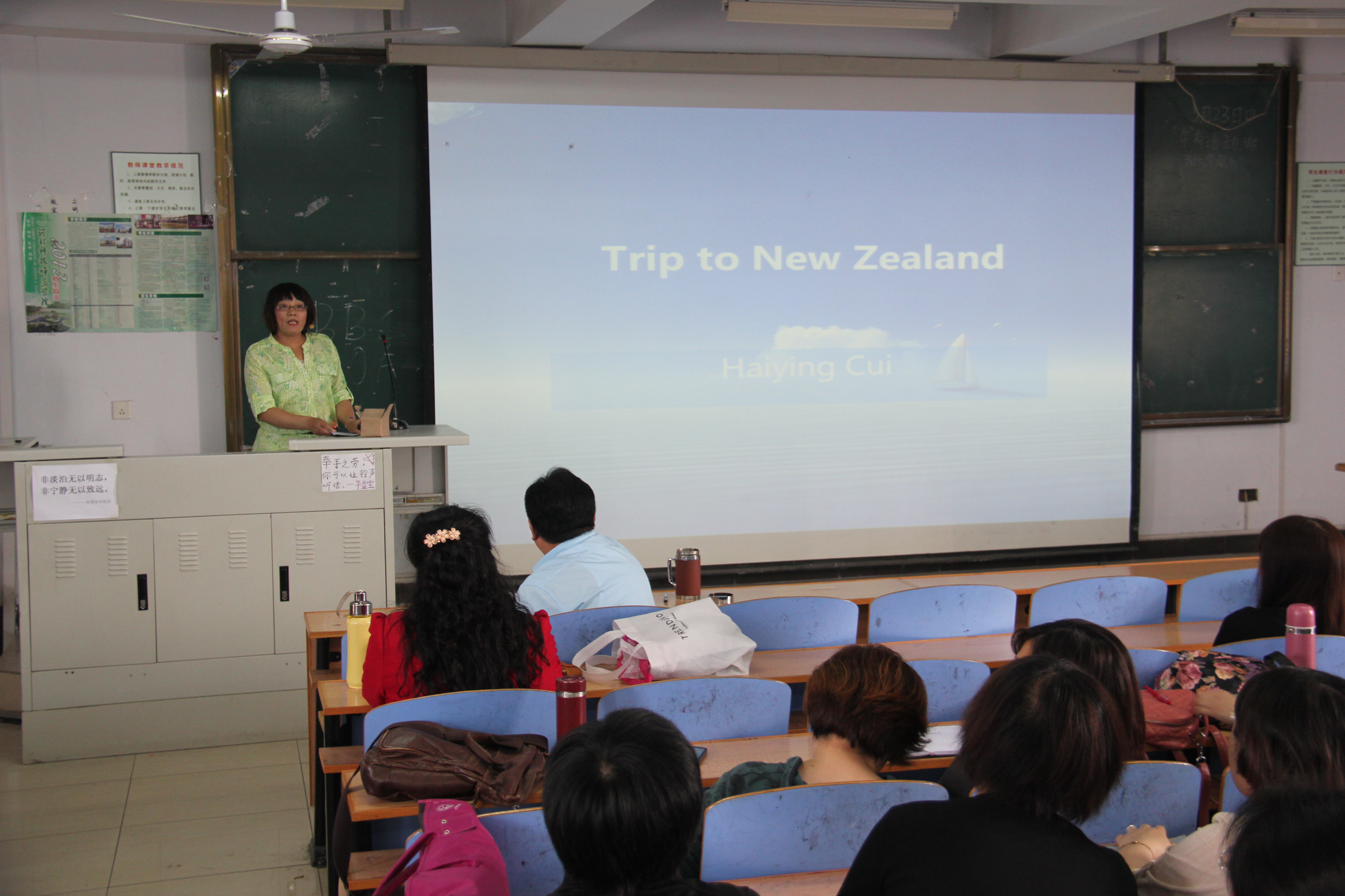会议由邵丽君经理主持,两位海外归国教师崔海英、张喜荣分别做了总结汇报。崔海英副经理主要从语言学习和语言应用方面介绍了新西兰之行的收获。在新西兰学习的三个月里,崔经理细心的总结了新西兰英语中的发音规律与不同,在住家生活中体会到了英语语言的魅力。张喜荣老师着重从课程学习和跨文化体验方面介绍了自己的收获。