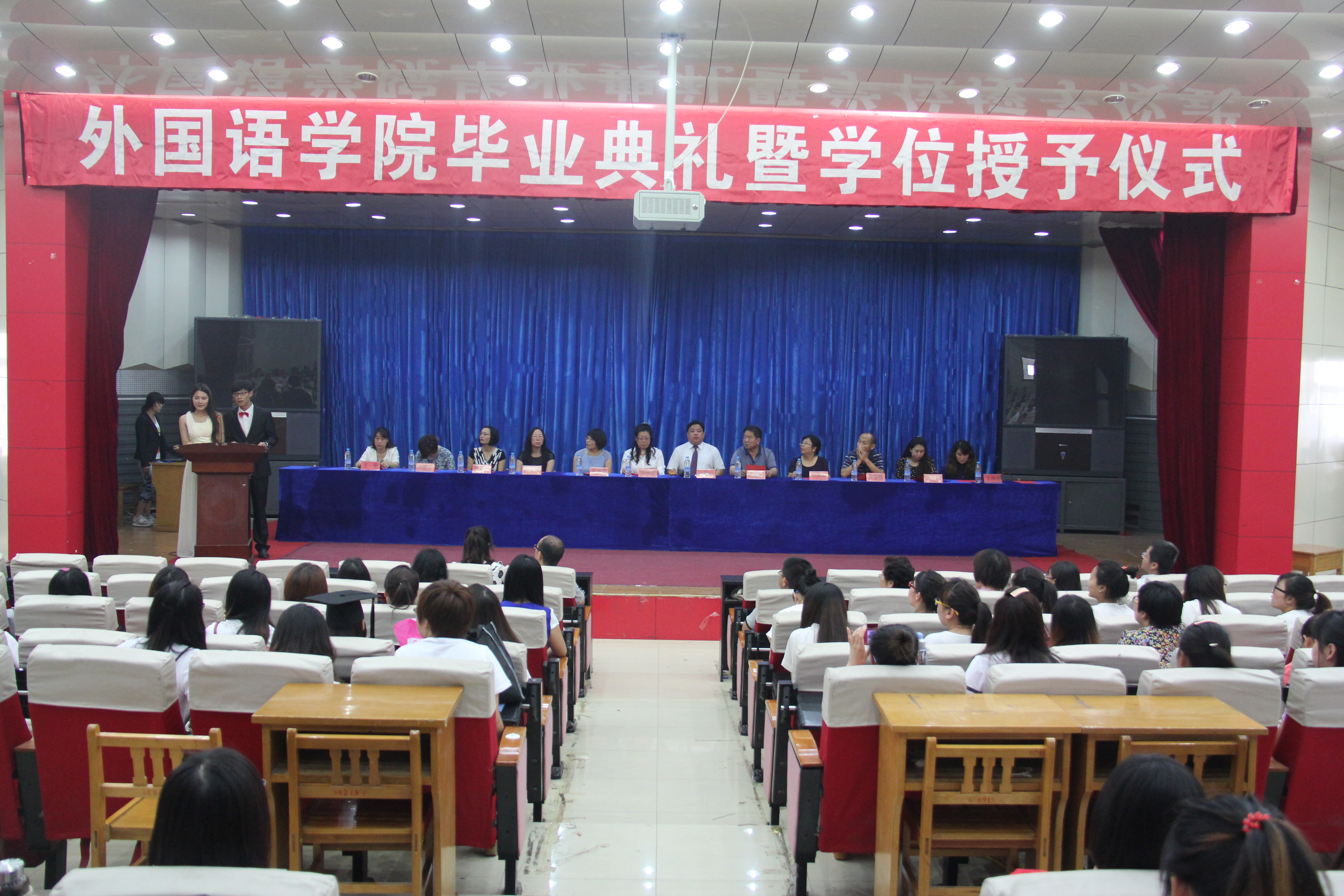 2014年6月17日上午,太阳成集团tyc122cc2014届毕业典礼暨本科生学位授予仪式在开发区学术报告厅隆重举行。外国语公司党委书记白雪松,经理邵丽君,副经理游建民、副经理崔海英以及各教学部主任和全体老师出席大会。即将学成毕业的309名2014届毕业生们满怀激动心情齐聚一堂参加了隆重而庄严的毕业典礼。