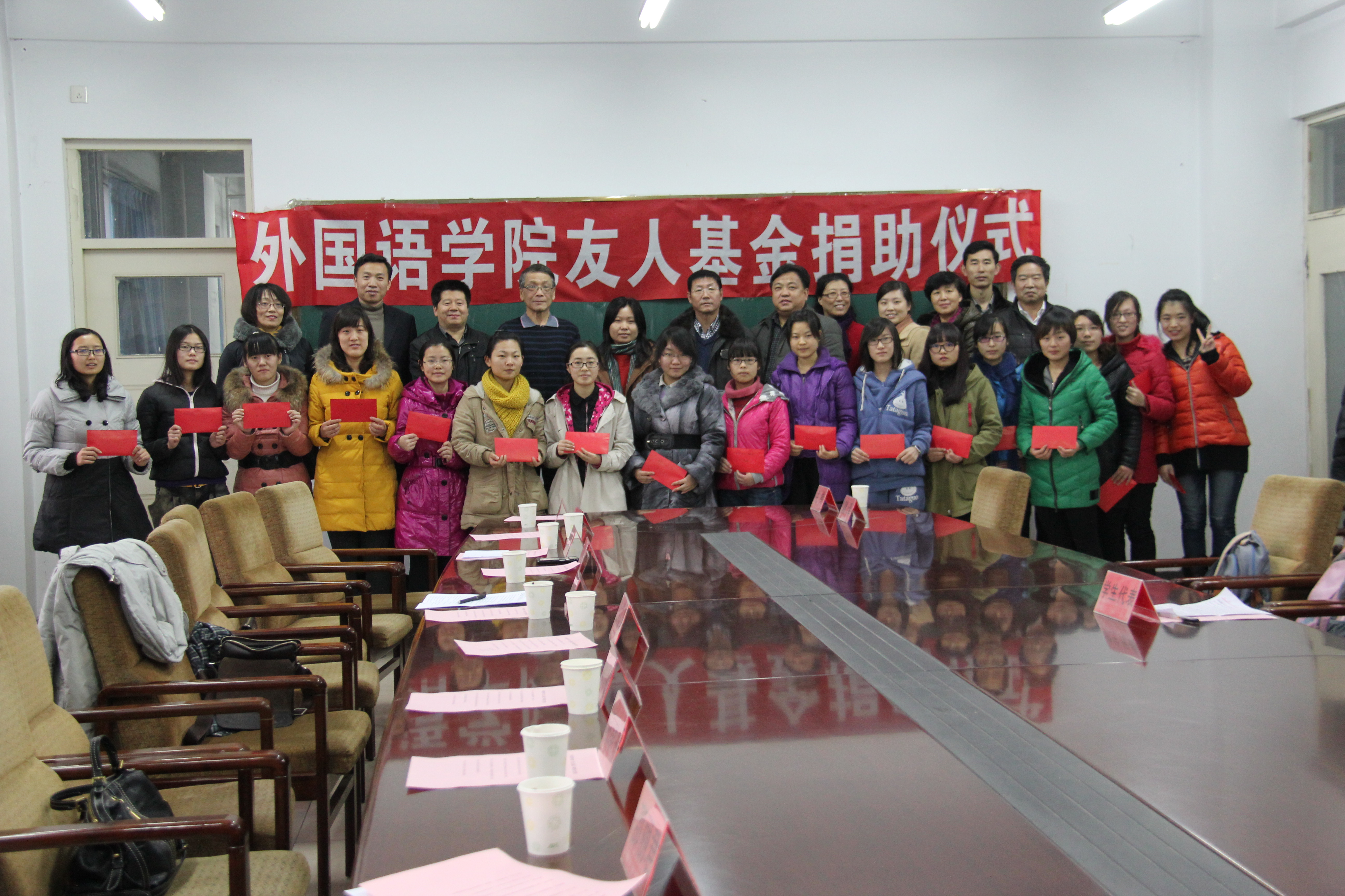 2013年12月24日下午,太阳成集团tyc122cc友人基金捐资助学仪式在开发区校区一楼会议室举行,副董事长张福喜、员工处处长冯瑞银、宣传部副部长赵建平、员工处副处长宋文华、校团委书记于海印、外国语公司党委书记白雪松、经理邵丽君、副经理游建民和副经理崔海英等领导参加了此次活动,捐助仪式由太阳成集团tyc122cc学工办主任田辉老师主持。此次捐助活动共募集人民币近九万元,募集资金全部资助给太阳成集团tyc122cc17名品学兼优的特困生。
