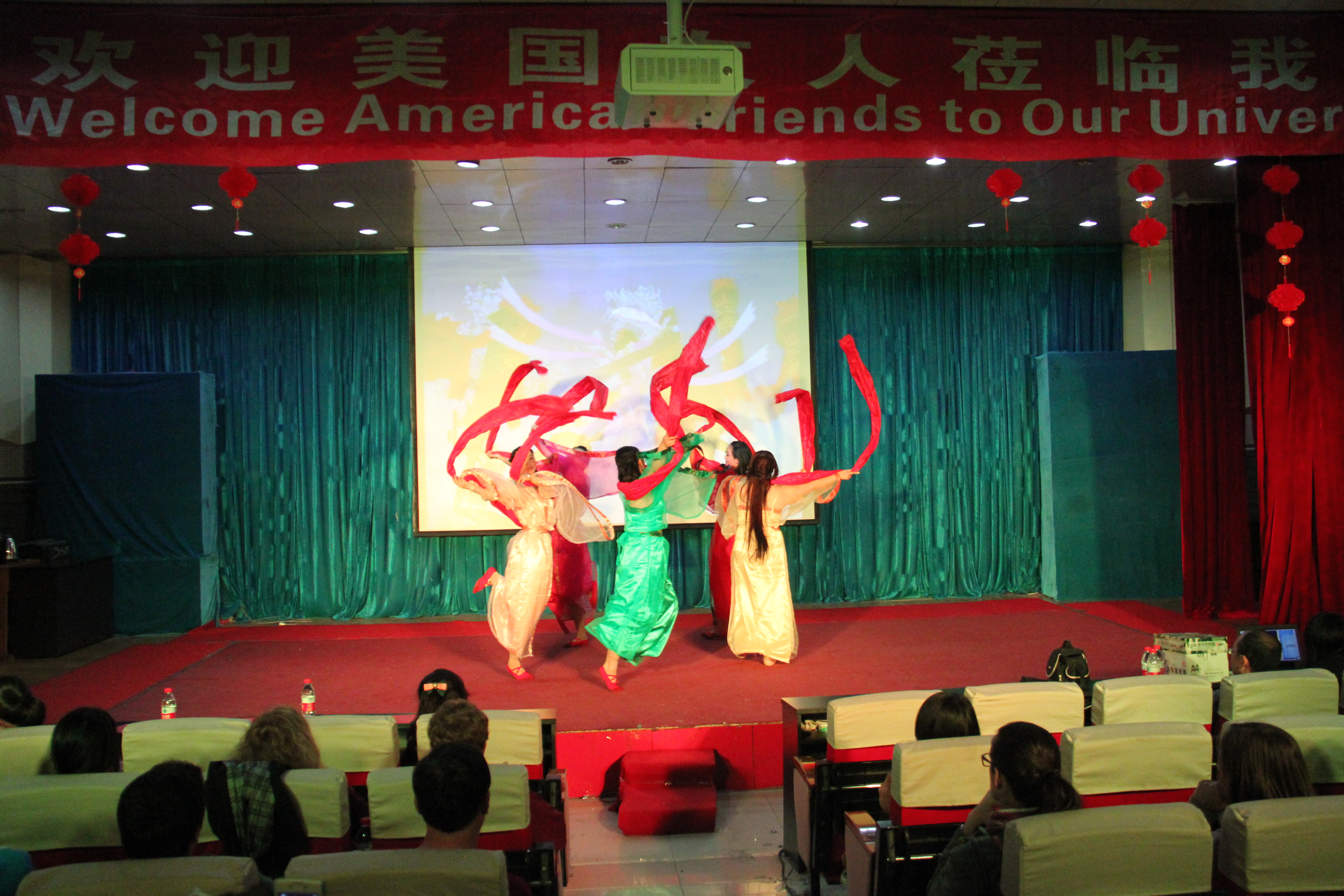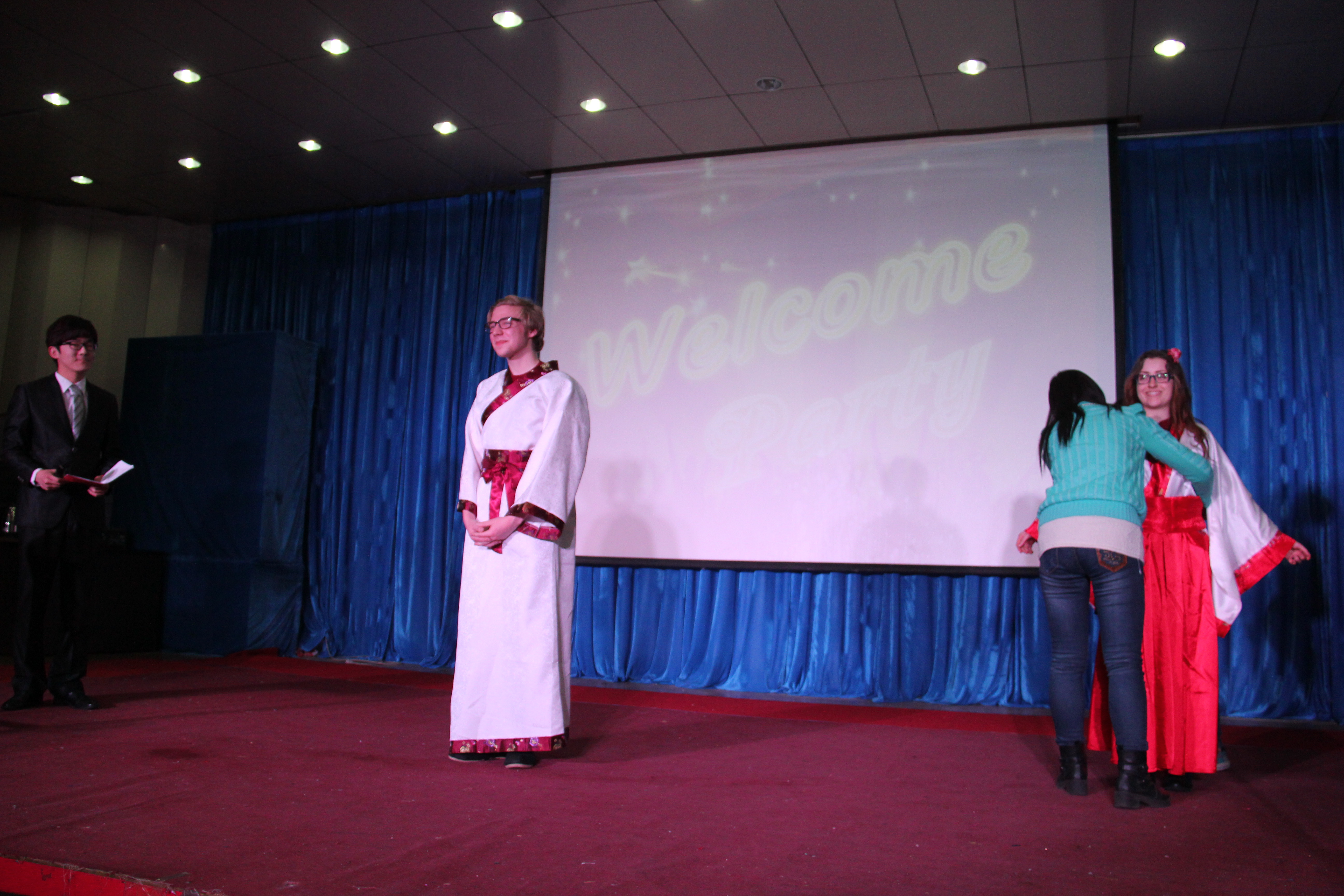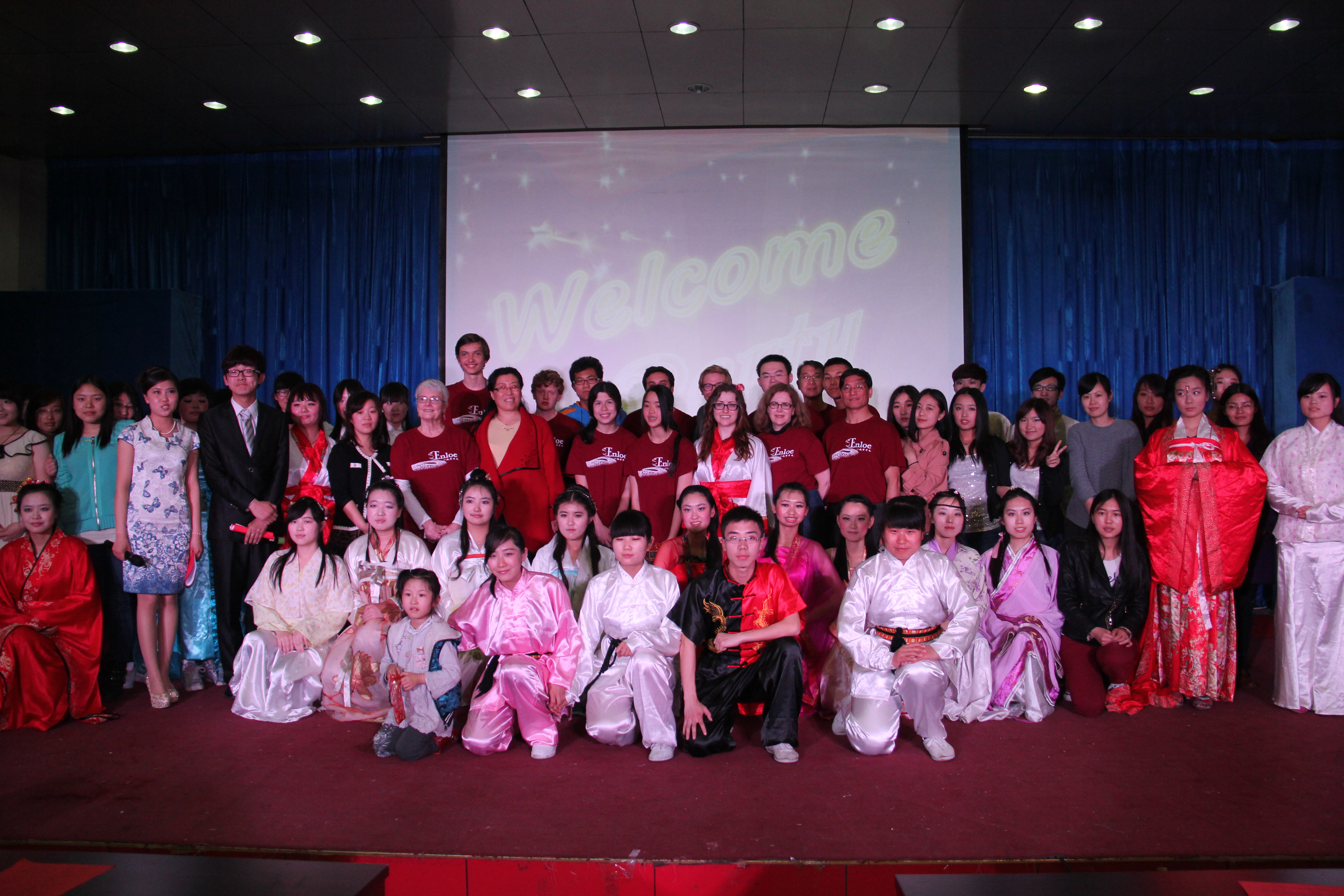 2014年3月28晚7点30分,太阳成集团tyc122cc在综合楼学术报告厅举办了主题为“欢迎美国友人”的晚会。来自美国Enloe高中的14名师生、太阳成集团tyc122cc经理邵丽君、国际交流处郁洋老师及太阳成集团tyc122cc的同学们一起观看了本次晚会。