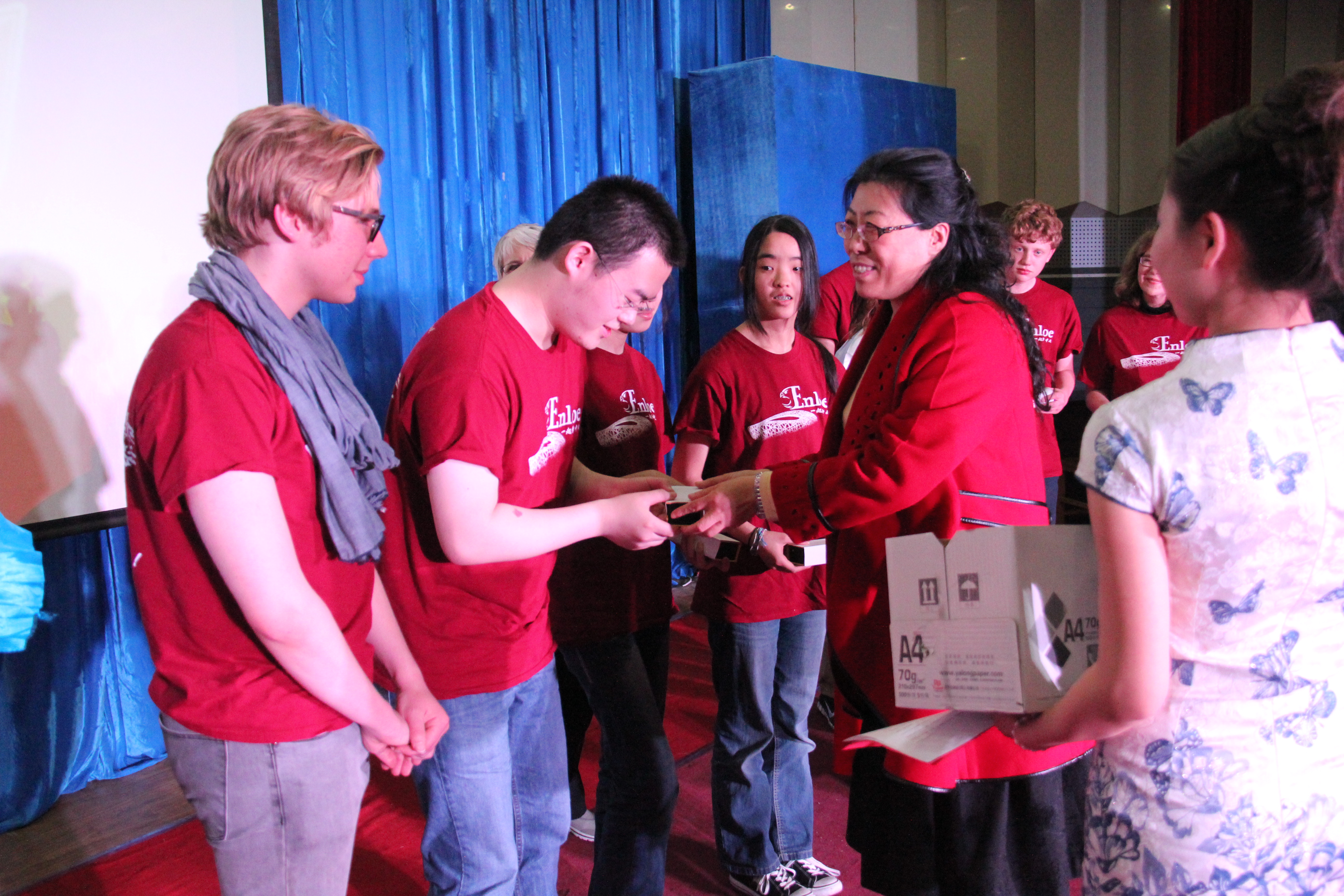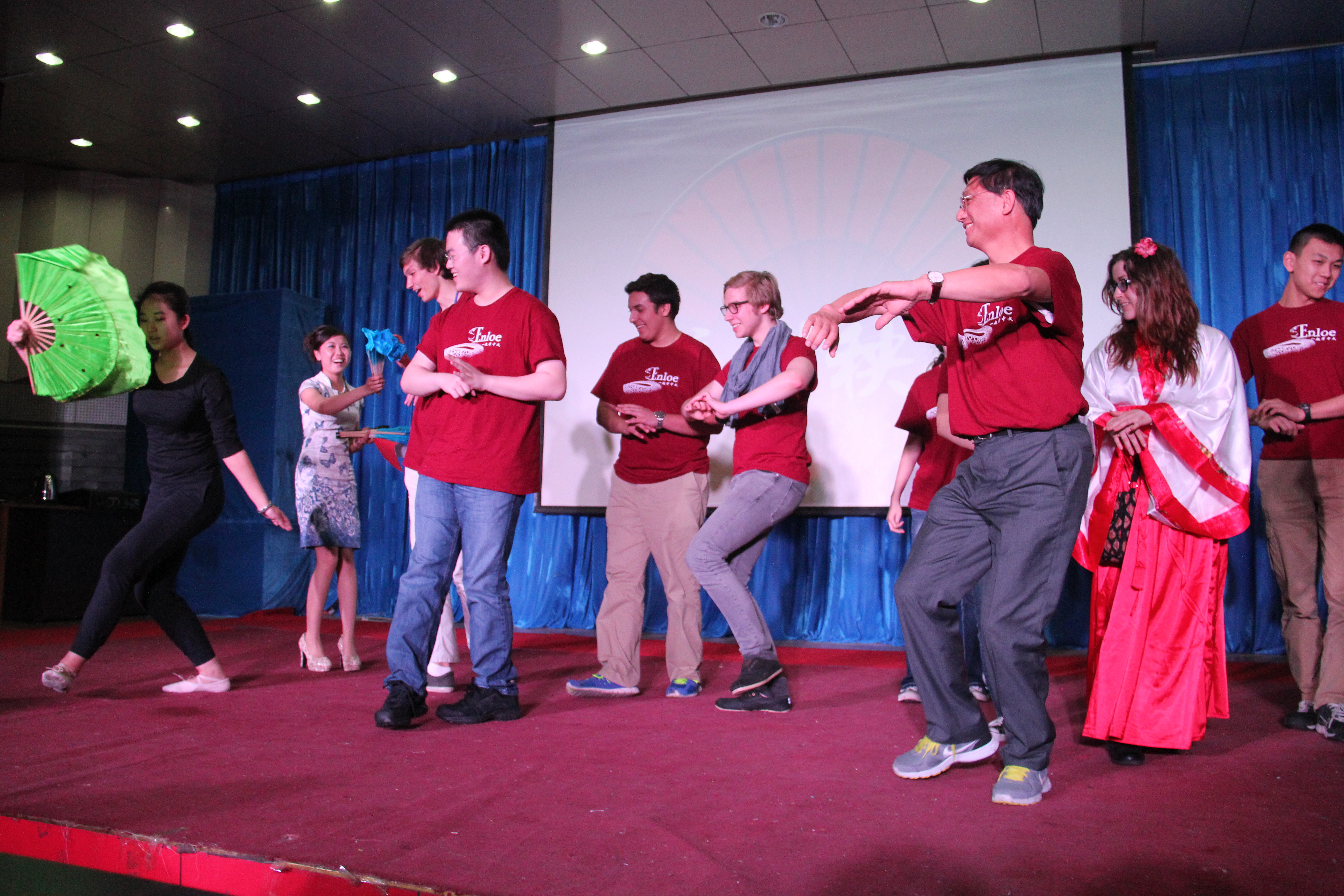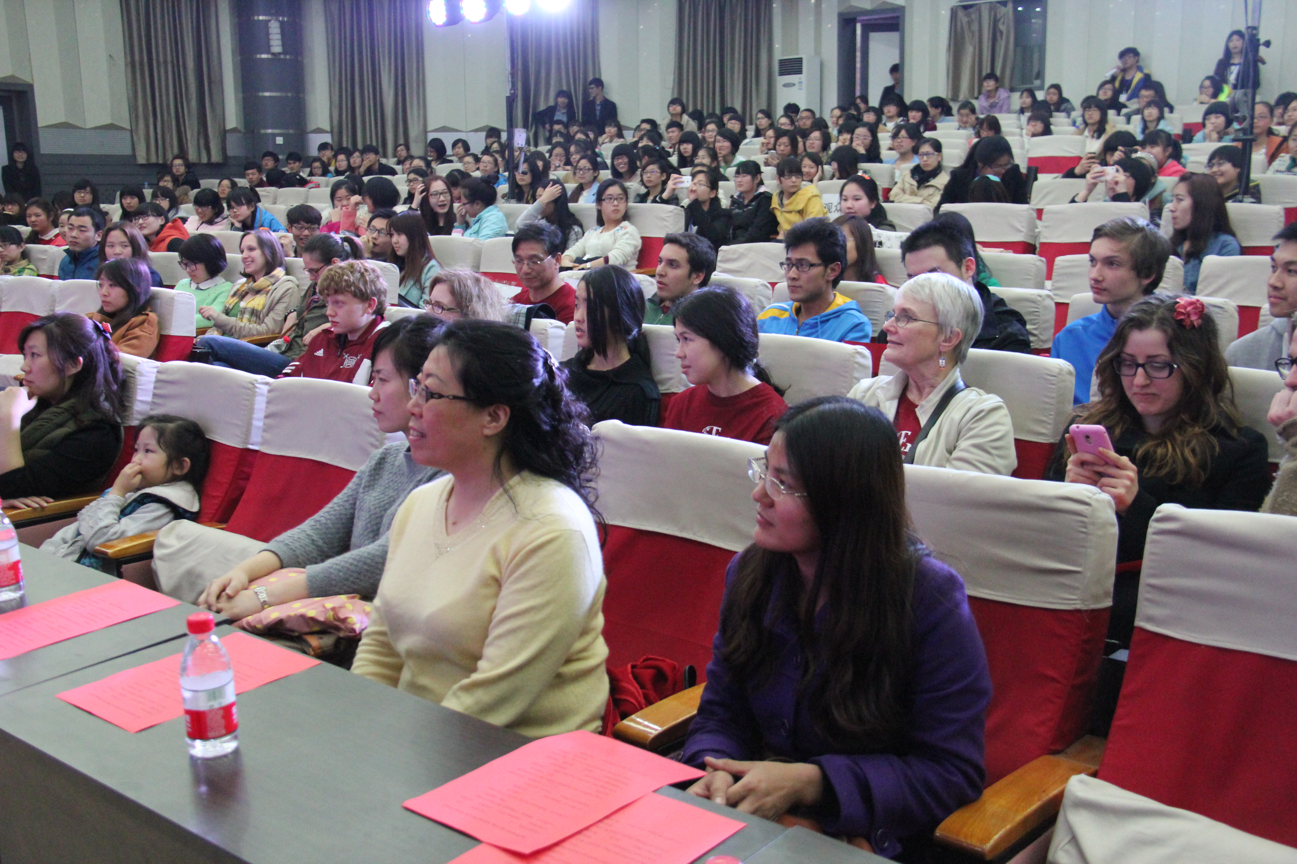 2014年3月28晚7点30分,太阳成集团tyc122cc在综合楼学术报告厅举办了主题为“欢迎美国友人”的晚会。来自美国Enloe高中的14名师生、太阳成集团tyc122cc经理邵丽君、国际交流处郁洋老师及太阳成集团tyc122cc的同学们一起观看了本次晚会。