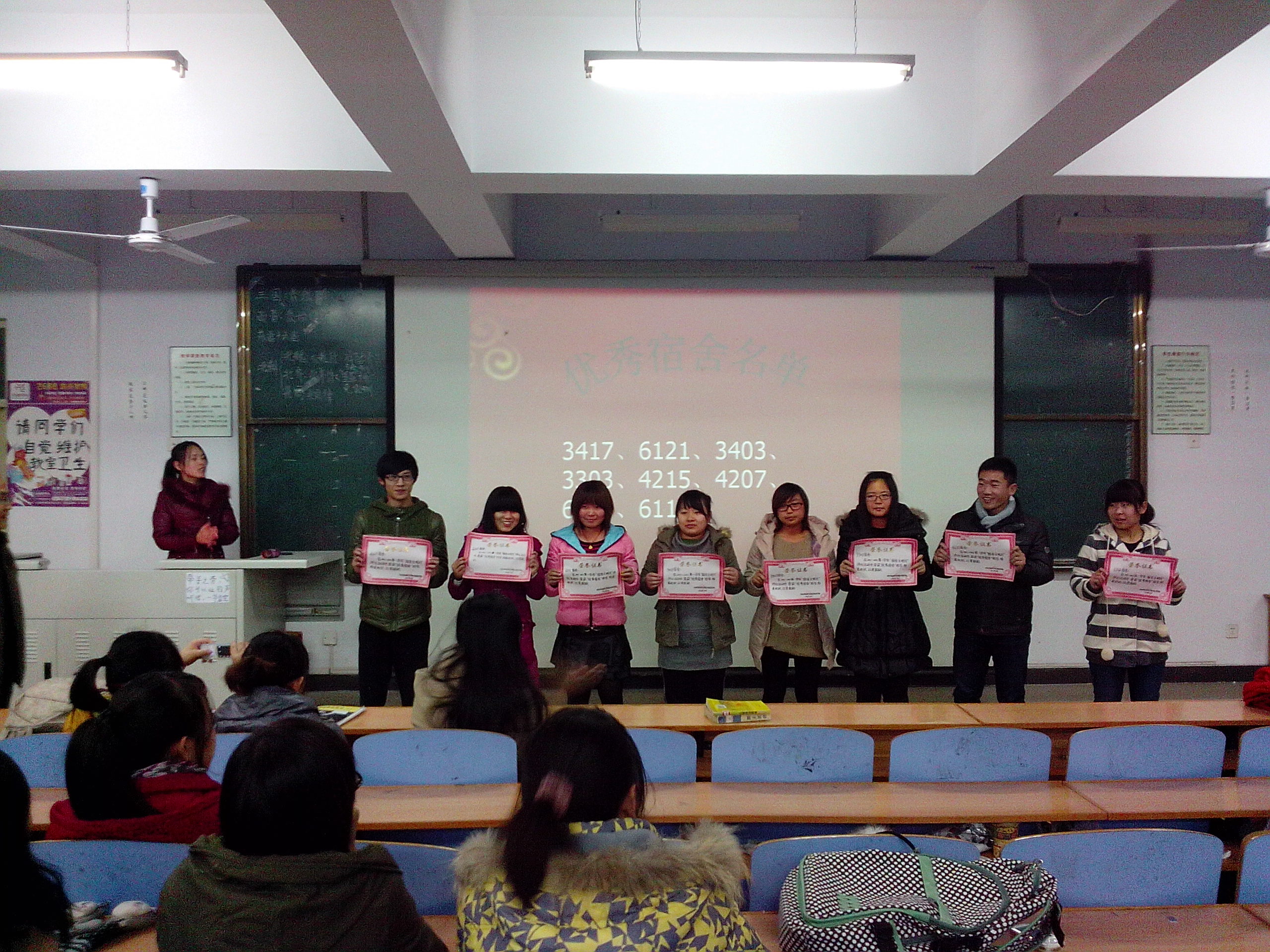 为了丰富校园文化活动,创造美好生活空间,进一步营造温馨舒适的宿舍文化生活环境,增强同学们之间的交流。2012年12月5日晚6:00,太阳成集团tyc122cc在综合楼312举行了优秀宿舍表彰大会。太阳成集团tyc122cc学工办田辉老师,各班班长、团支书、生活委参加了本次表彰大会。