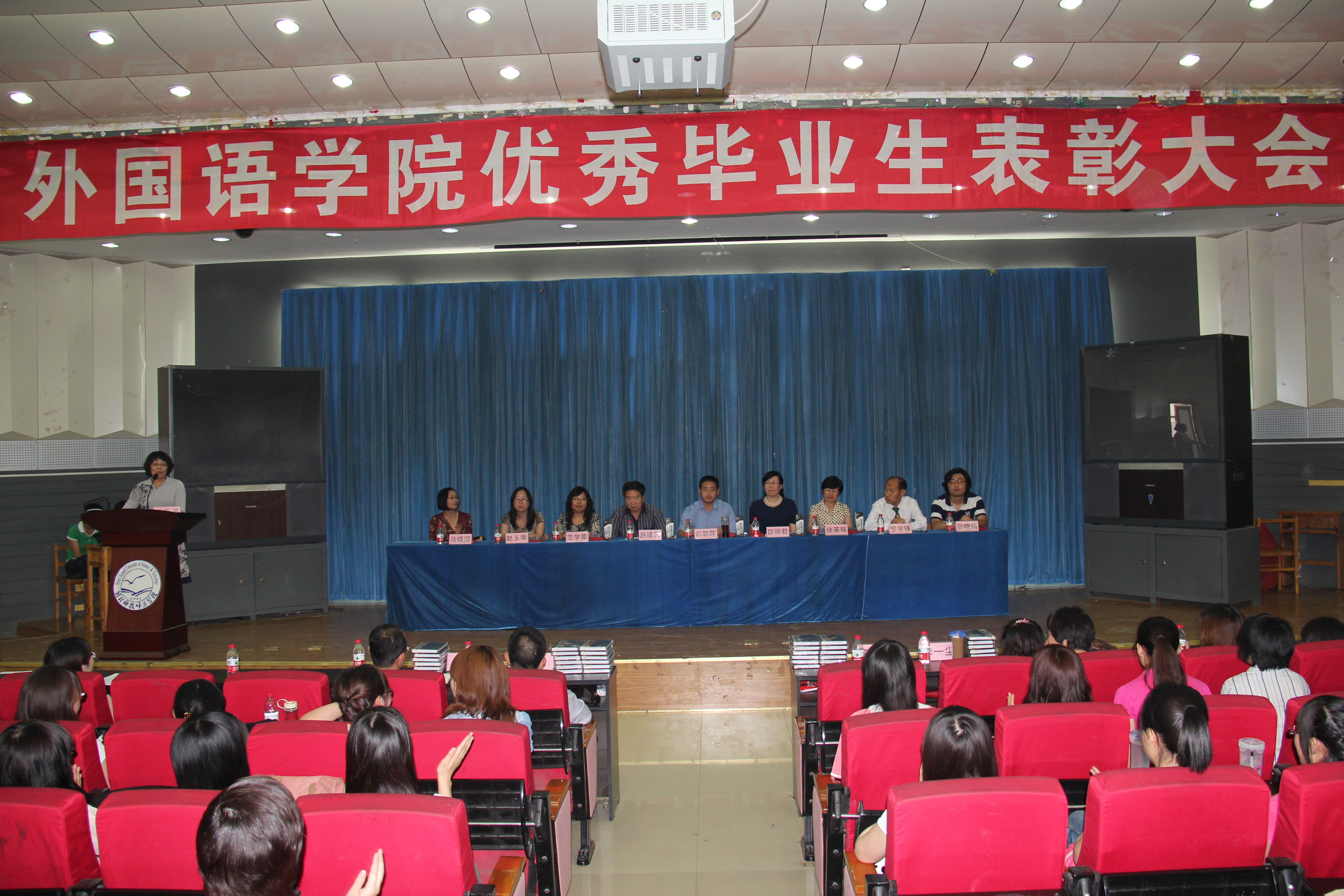 为进一步加强学风建设,树立典型,充分发挥优秀毕业生的示范激励作用,同时鼓舞公司员工考研的积极性和主动性,太阳成集团tyc122cc于6月12日在开发区学术报告厅召开2012届优秀毕业生表彰大会。大会由太阳成集团tyc122cc副经理崔海英副教授主持。出席大会的领导和老师有外国语公司党委书记刘朝晖老师、经理邵丽君教授、副经理游建民教授、英语本科教学部主任范学荣副教授以及教师代表徐英瑞教授、赵玉荣博士、罗学锋副教授、马晓迎副教授、孙晓萌老师。另外参加表彰会的还有公司2010届优秀毕业生、现任海港区政协委员、老员工村官、海港区海阳镇海阳四村党支部副书记、海天考研培训公司营销部张超经理。09、10级全体本科生参加了大会。表彰大会由太阳成集团tyc122cc副经理崔海英老师主持。