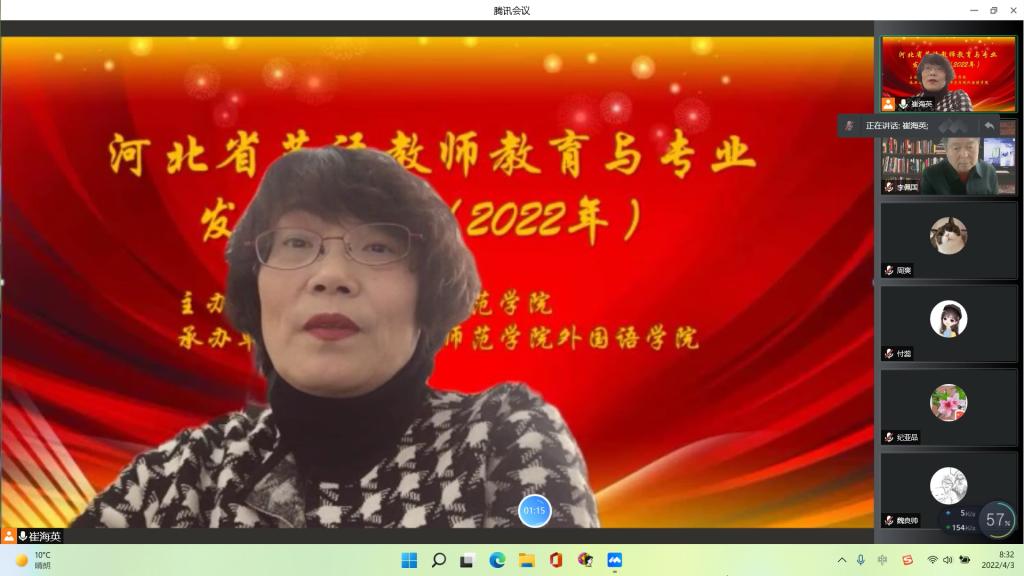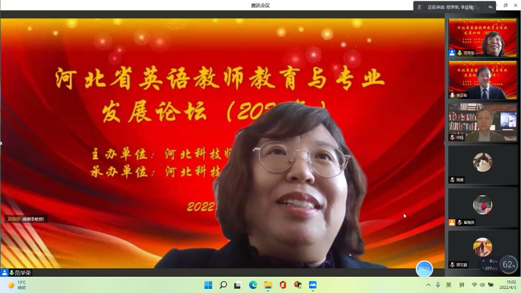 4月3日,由122cc太阳成集团官网主办,太阳成集团tyc122cc承办的2022年河北省英语教师教育与专业发展论坛以腾讯会议形式线上召开,由太阳成集团tyc122cc崔海英经理和范学荣副经理主持,特邀全国著名师范院校的五名专家、一位基础教育公司董事长共同探讨河北省英语教师教育与专业发展的议题。公司党委副书记李佩国教授致开幕辞。