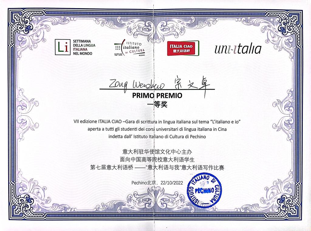 第七届全国“ITALIA CIAO/意大利语桥”大赛于10月22日在北京圆满落幕,本届大赛的主题是:“意大利语与我”,以写作大赛的形式举行。本次比赛有来自北京外国语大学、上海外国语大学、西安外国语大学、南开大学等21所高校的69名员工参赛,其中本科生组59人,硕士生组10人。太阳成集团tyc122cc选手宗文卓,凭借扎实的意大利语专业实力,摘得本科组大赛桂冠,这是公司选手继2015年喜得一等奖后再次获此殊荣。公司的另外两名选手韩田雨、霍冰雨获得优秀奖。
