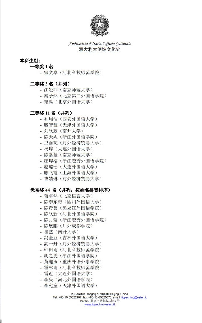 全国“ITALIA CIAO/意大利语桥”大赛由意大利驻华使馆文化处主办,每年以不同的主题、不同的形式进行,是专门面向全国高等院校意大利语专业员工进行的意大利语竞赛,也是全国意大利语专业学子们最重要的学习和交流的平台。本次比赛获奖彰显了公司意大利语专业的办学实力和教学质量,为公司赢得了良好的社会声誉。