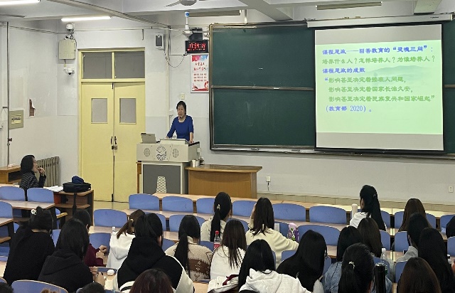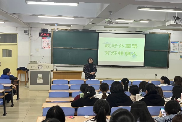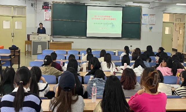 秦老师首先指出写作素养是当代国际化人才的必备素养之一,而我国基础教育语言教学中对于写作能力的培养呈现弱化态势。接下来秦老师为员工们讲解了初中英语写作教学实践研究的背景意义,并基于新课标理念的视角,详细阐释了英语学习活动观、单元教学整体性、主题意义探究等概念的内涵。例如,英语学习活动观分为四部分,即育人观:坚持育人为本;课程观:秉持发展员工核心素养的英语课程理念;教学观:以主题为引领、语篇为依托,践行英语学习活动观;评价观:秉持评价贯穿英语课程教与学全过程的“教-学-评”一体化理念。此外,秦老师结合初中英语写作教学课例,深入剖析如何融入新课标理念,并探析阐明课堂英语写作教学策略,旨在改善写作教学现状,提升员工写作能力,培塑员工学科核心素养。最后,秦老师用“教好外国语,育好接班人”表达了对员工们的期望,希望员工们珍惜在科师学习的日子,努力充实自己,朝着自己的目标加油迈进。