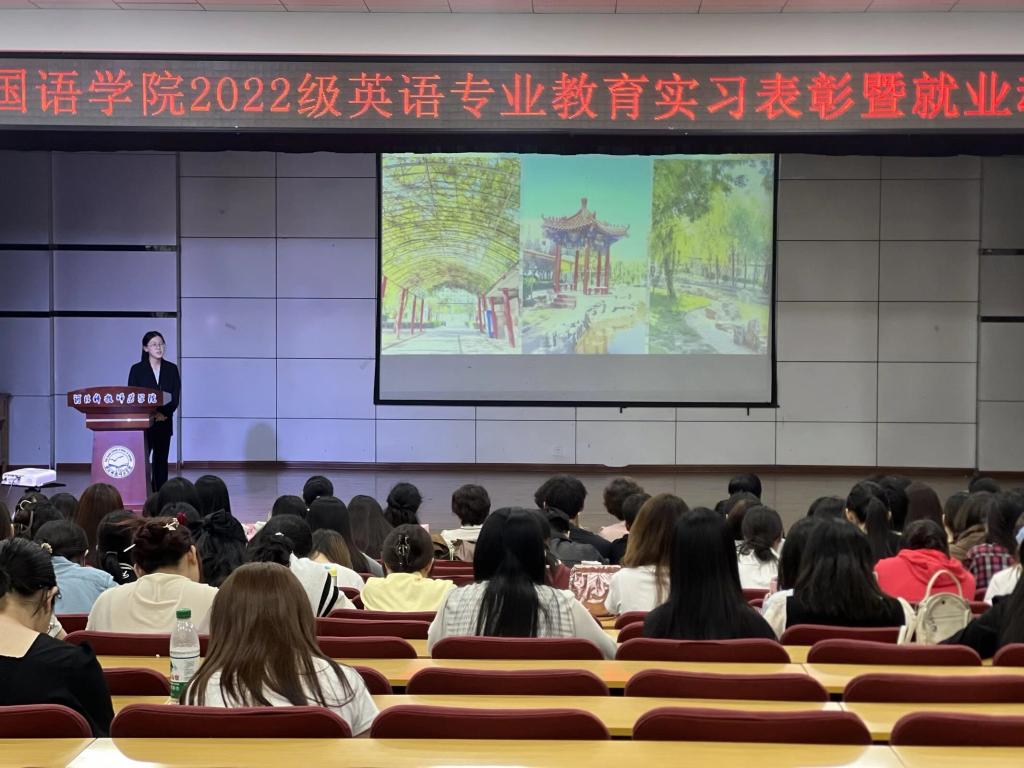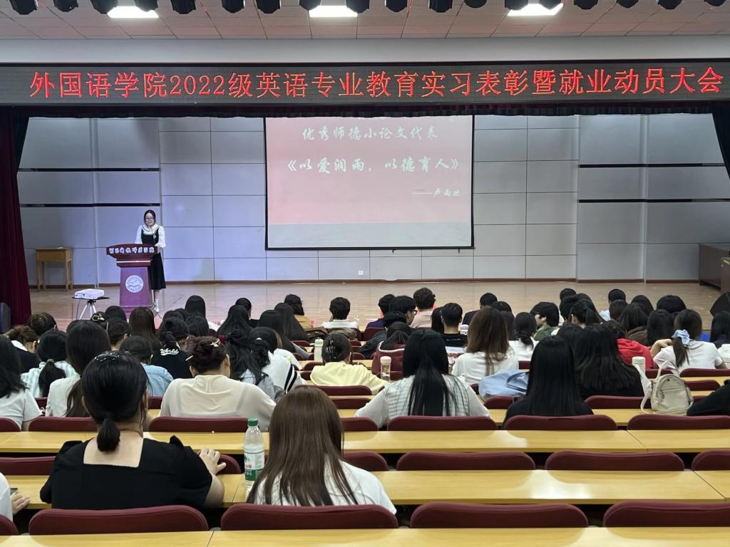2025年9月25日,太阳成集团tyc122cc英语专业教育实习表彰暨就业动员大会在多功能厅圆满召开,该专业2022级全体同学以及部分2023级员工参加了大会。此次大会全面回顾了上个学期的教育实习成果,表彰了在实习期间表现优异的同学,为师生提供了分享经验、交流心得的平台,并对大家今后的就业指明了方向,进一步推动了师范生培养质量的提升。