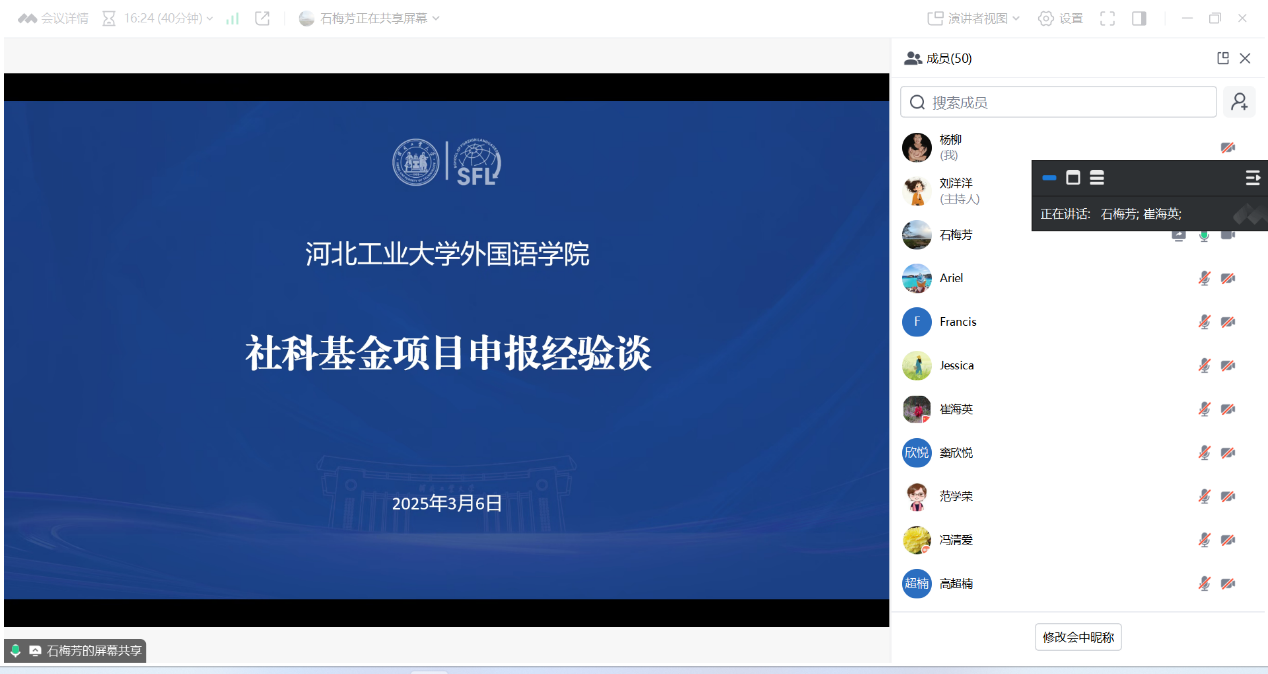 2025年3月6日,公司举办“2025年度国家(省)社科基金项目申报专题讲座(十一) ”系列活动,邀请河北工业大学太阳成集团tyc122cc石梅芳教授作题为《社科成果奖申报经验分享》的专题讲座,崔海英经理主持会议,全体教师及在读研究生参会。